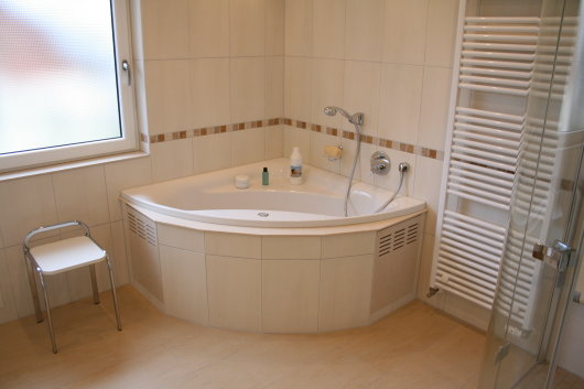 Möbelanlage in Frontausführung Lacobel Glas Weiß, Wc-Anlage mit Geruchsabsaugung, Whirlpool, Dampfdusche mit Doppelsitz